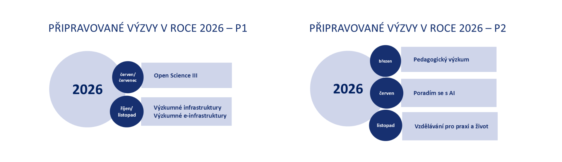 V průběhu roku 2026 bude vyhlášeno celkem šest nových výzev. V Prioritě 1 zaměřené na výzkum a vývoj jsou připravovány výzvy Open Science III, Výzkumné infrastruktury a Výzkumné e-infrastruktury. Priorita 2 orientovaná na vzdělávání nabídne dnes schvalovanou výzvu Pedagogický výzkum a výzvy Poradím se s AI a Vzdělávání pro praxi a život. Připravované výzvy reagují na aktuální potřeby českého vzdělávacího systému i oblasti výzkumu a vývoje.