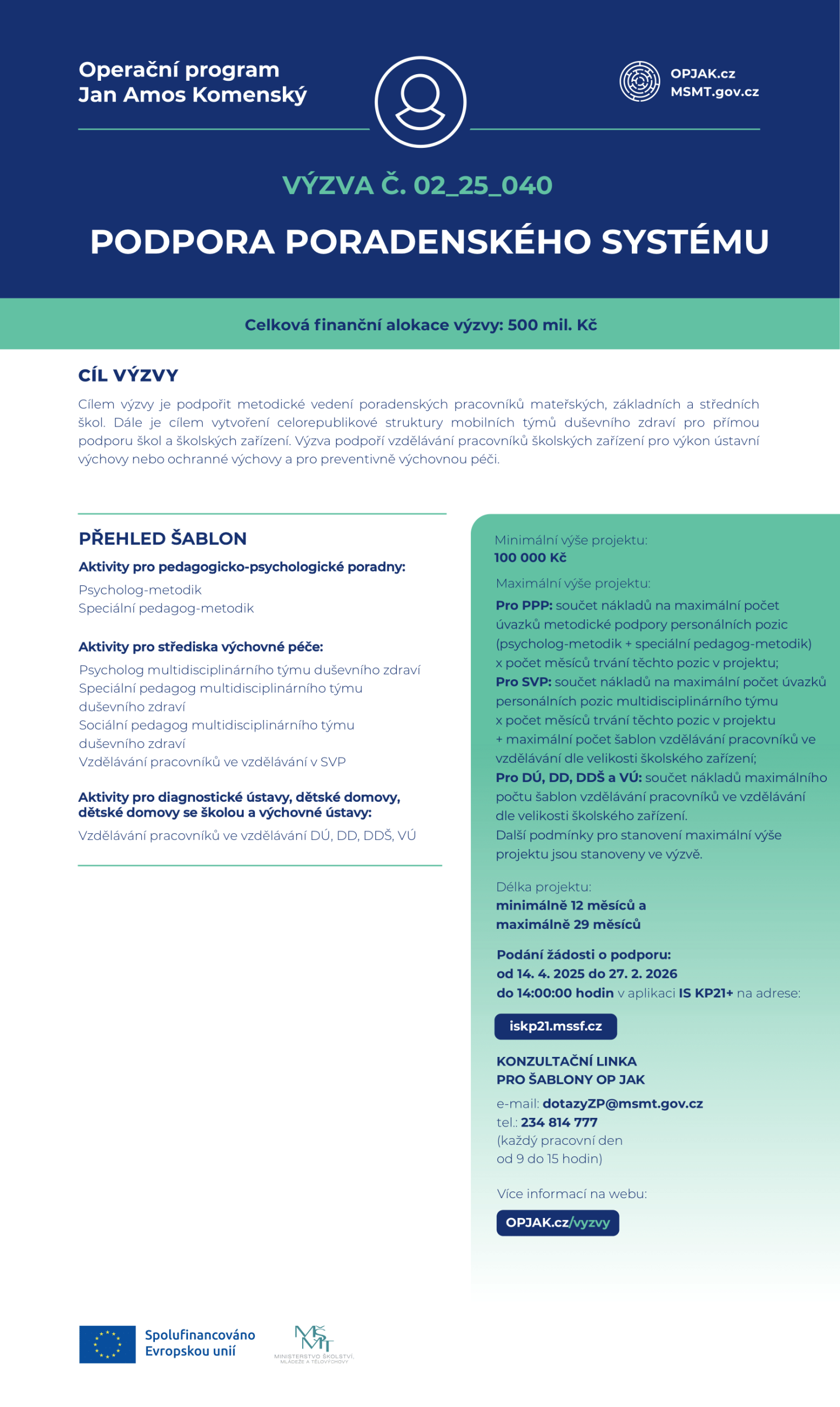 Řídicí orgán OP JAK dne 27. 3. 2025 vyhlašuje výzvu č. 02_25_040 Podpora poradenského systému, jejímž cílem je podpořit metodické vedení poradenských pracovníků mateřských, základních a středních škol prostřednictvím poskytnutí podpory ze strany pedagogicko-psychologických poraden. Dále je cílem vytvoření celorepublikové struktury mobilních týmů duševního zdraví pro přímou podporu škol a školských zařízení při vzdělávání a výchově dětí […]